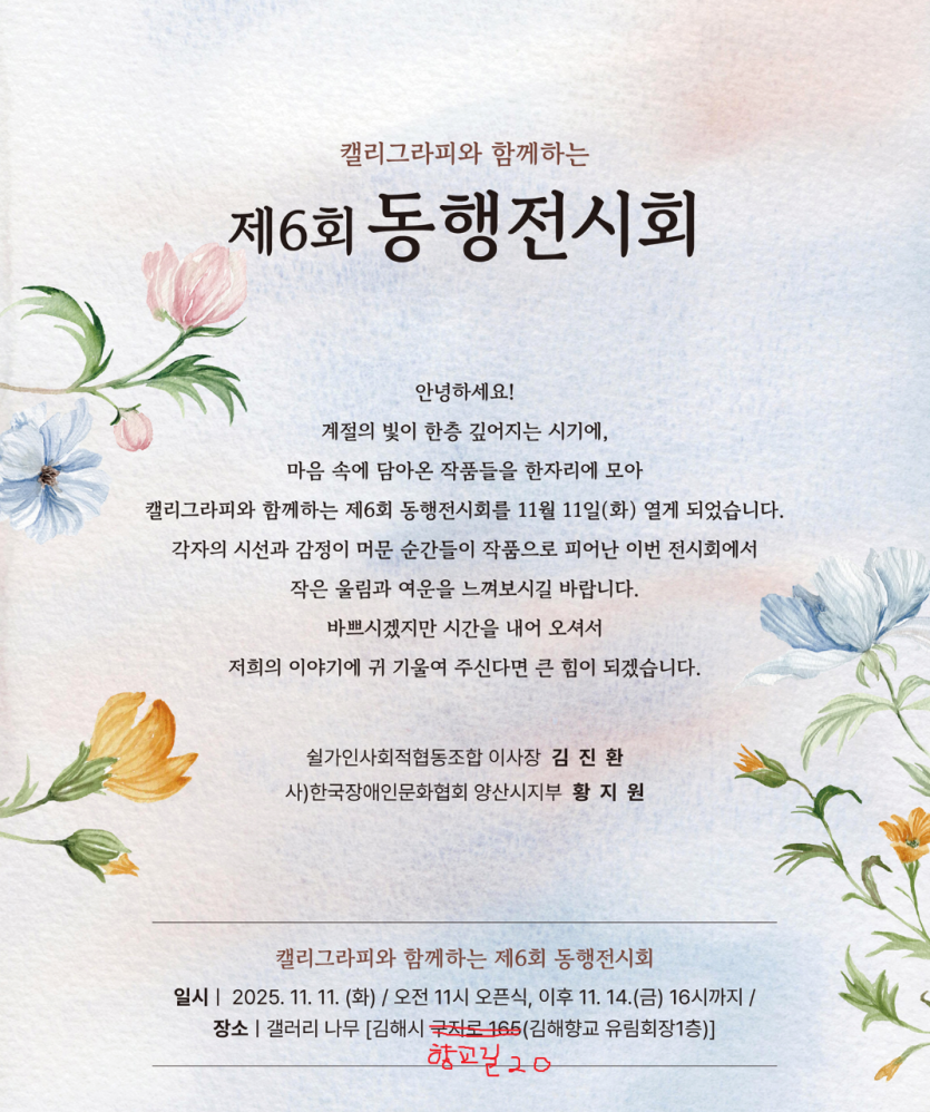 특별히 이번 전시회는 우리 님들 손 끝으로 써 내려간 캘리그라피 작품과 함께 전시하게 되었답니다.